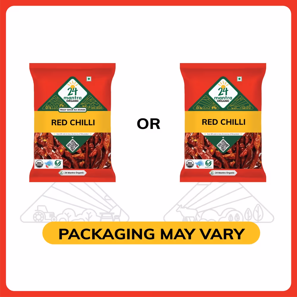 These organic whole red chillies add a rich color and mild heat to dishes, making them ideal for Indian cuisine. They are packaged in a 100g pouch
