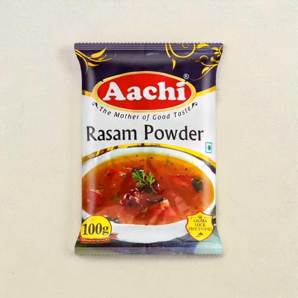 In a pot, bring tamarind water to a boil with tomatoes and curry leaves. Add Aachi Rasam Powder and let it simmer for a few minutes. Temper mustard seeds and red chillies in oil, and pour over the rasam. Garnish with fresh coriander leaves and serve hot
