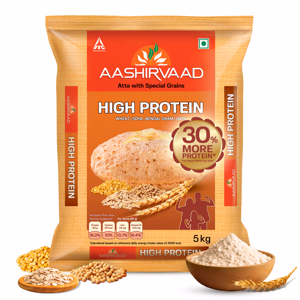 Aashirvaad atta with high protein blends wheat, soya, bengal gram, and oats. Just 3 rotis give 24% daily protein, support muscle health, aid digestion, and offer nutrition with the taste you love