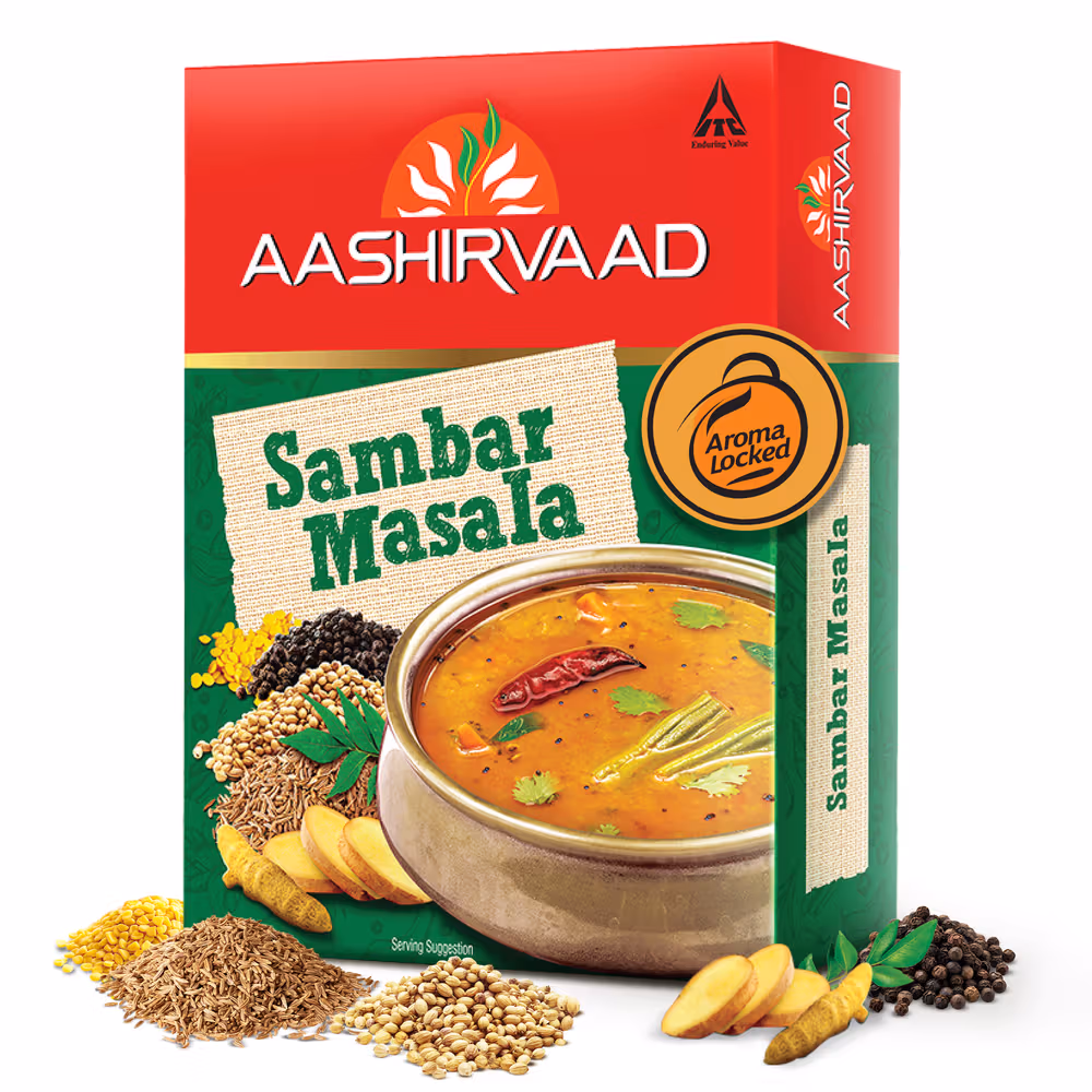 Coriander (31.9%), Red Chilli, Cumin (5.2%), Black Pepper (5.2%), Fenugreek, Compounded Asafoetida, Mustard, Ginger (0.9%), Dehydrated Curry Leaves (0.8%), Turmeric (0.3%), Iodized Salt, Chana Dal (6.2%), Arhar Dal, Urd Dal, Refined Sunflower Oil