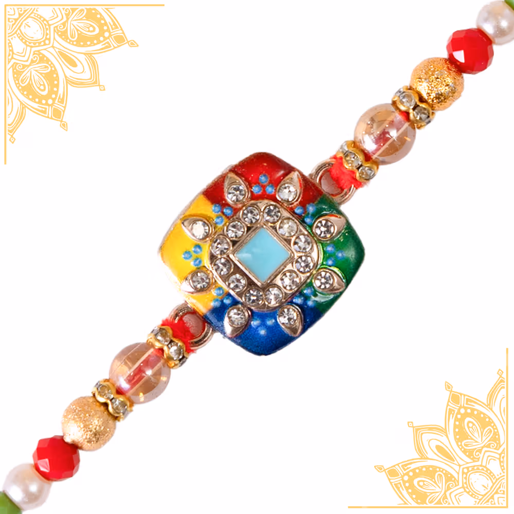 Decorative multicoloured centerpiece, vibrant beads and pearls arrangement, traditional red thread design, elegant gift packaging