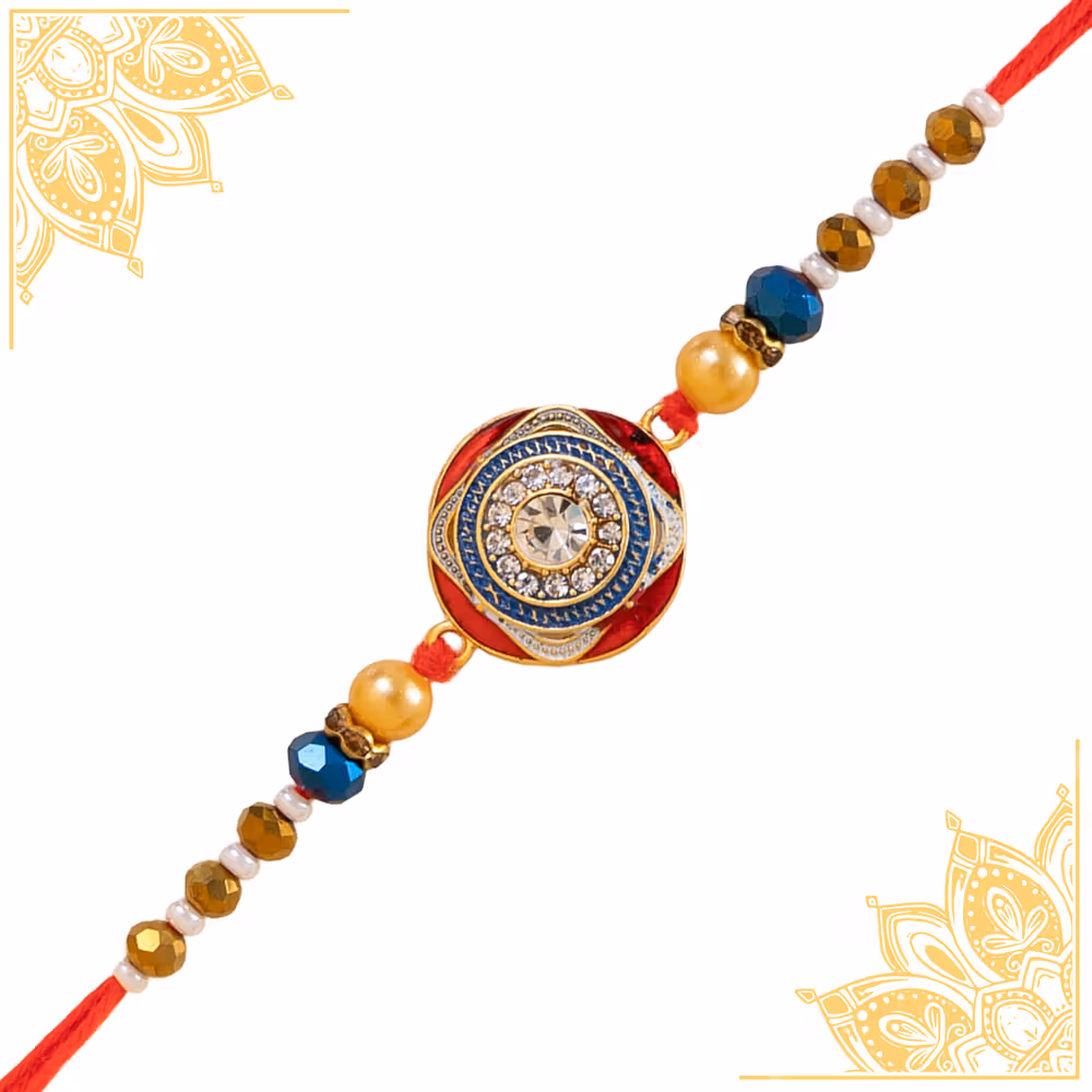 Elegant abstract design with stones, vibrant red and blue color combination, comes in decorative gift box, durable thread material