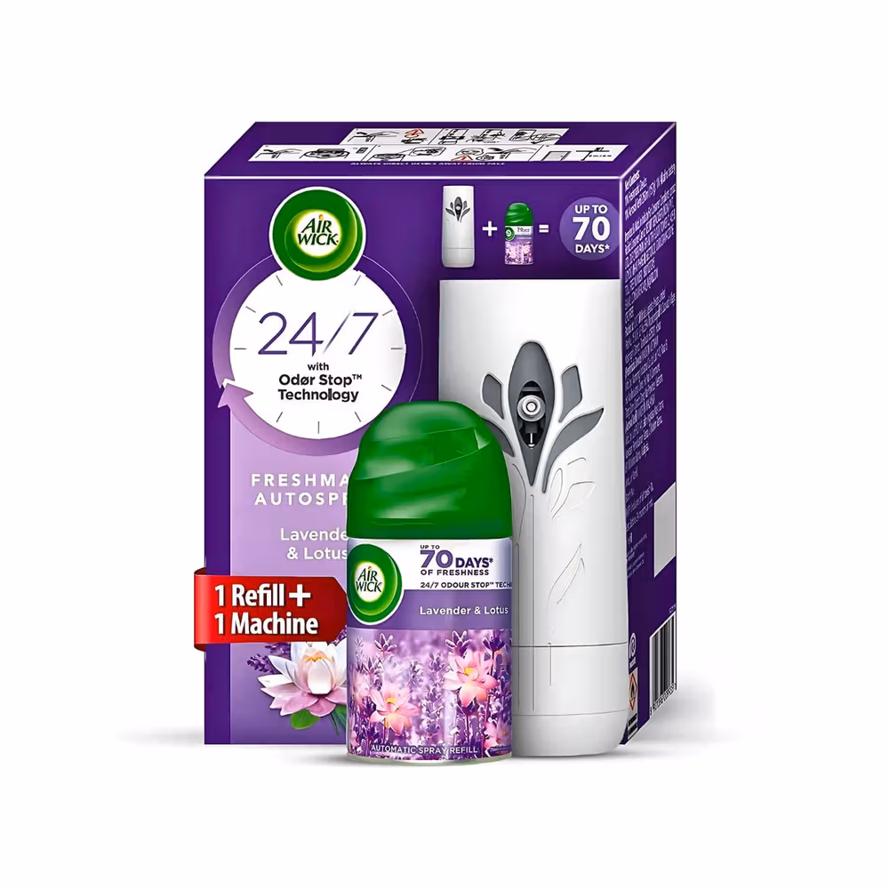 Automatic spray for continuous freshness, lasts up to 70 days on low setting, includes gadget, batteries, and refill, lavender and lotus fragrance for relaxation