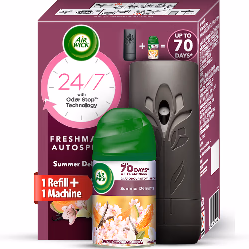 Automatic air freshener kit, lasts up to 70 days, adjustable fragrance settings, includes batteries and refill