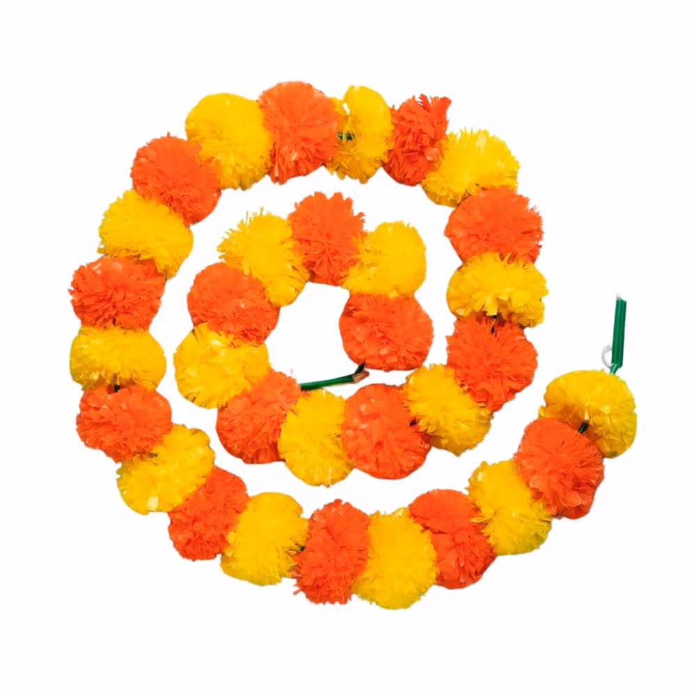 Vibrant artificial marigold design, perfect for festive decor, lightweight and easy to hang, reusable and durable