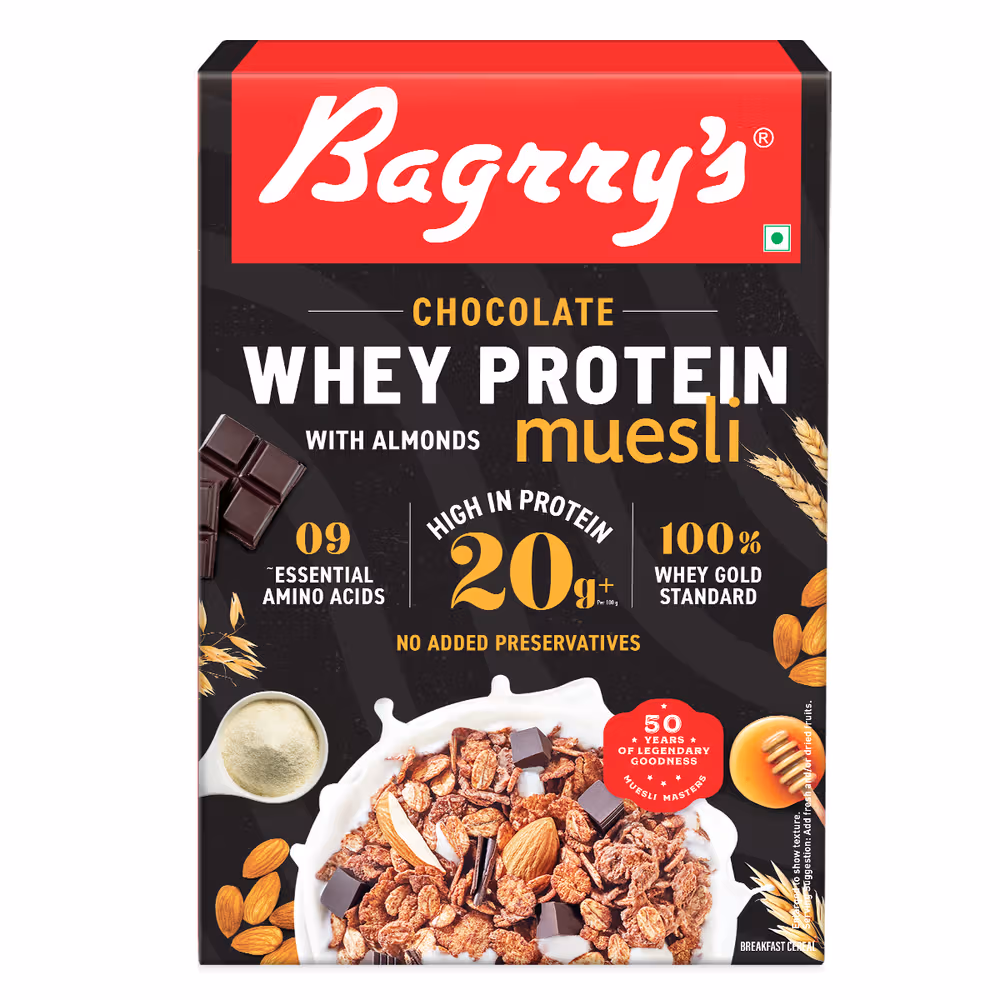 Multigrain 50% (Rolled Oats 28.9%, Whole Wheat Flakes 21.1% (Wheat, Sugar, Iodised Salt, Cereal Extract, Antioxidants (INS 322 , 307B))), Protein Blend 17% (Whey Protein (6.1%), Soya Protein Isolate (5.6%), Texturised Soya Protein (5.3 %)), Invert Syrup, Chocolate Powder 6.4% (Sugar , Cocoa Solids), Almonds 6%, Wheat Bran, Antioxidants (INS 322 , 307B), and Honey 0.5%