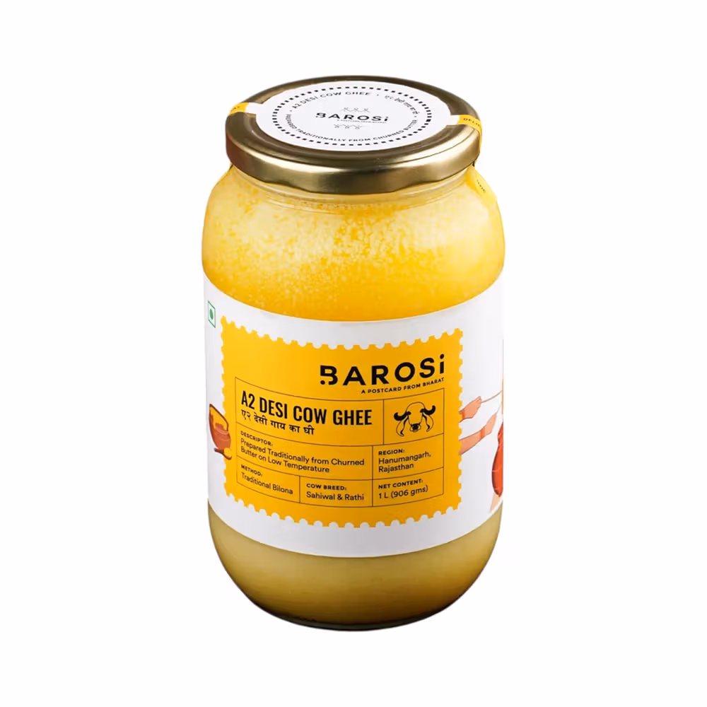 Barosi A2 Desi Cow Ghee is traditionally made using the Bilona method, rich in Omega-3 fatty acids, and supports digestion and overall well-being