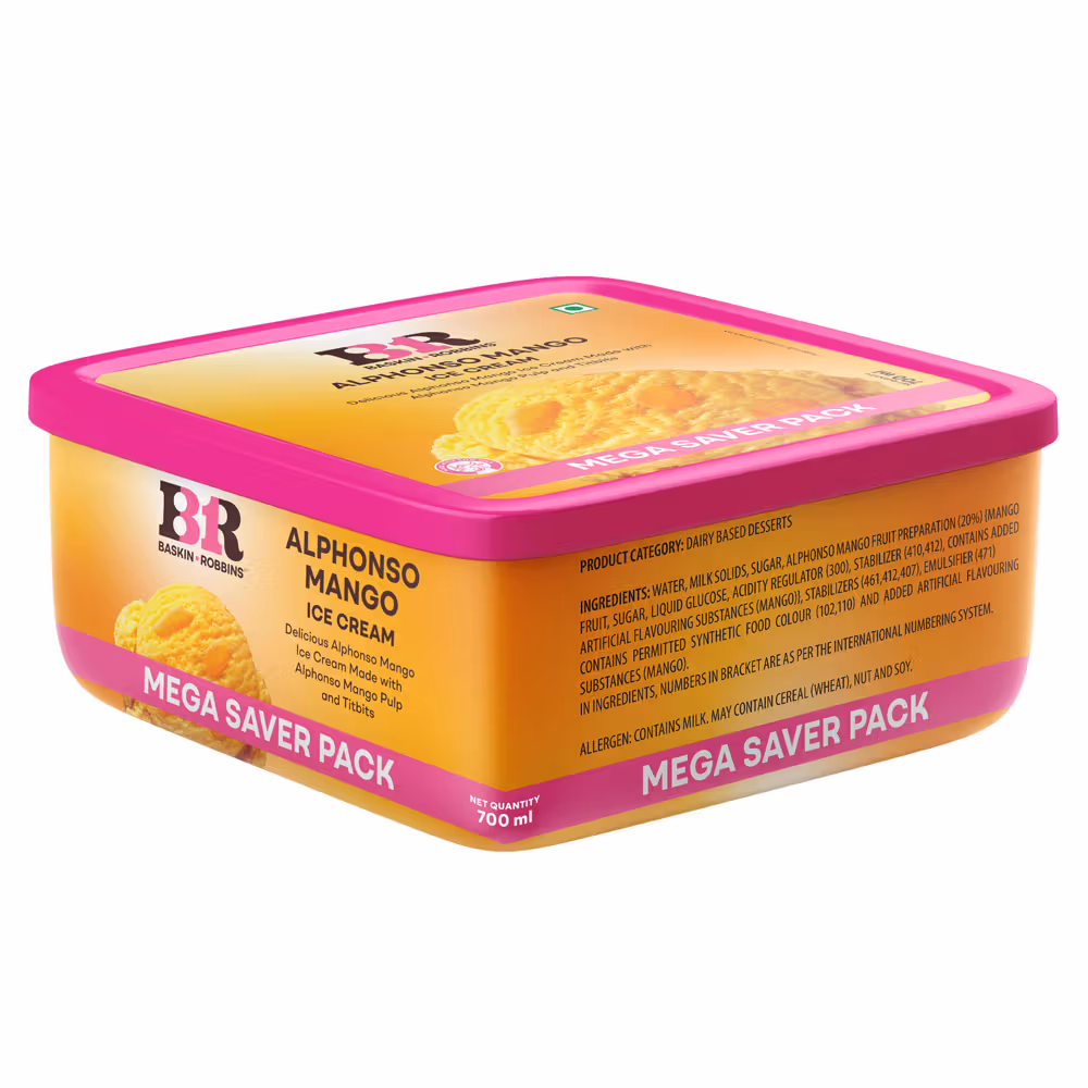 Added Artificial Flavouring Substances (Mango), Alphonso Mango Fruit Preparation (20%) (Mango Fruit, Sugar, Liquid Glucose), Acidity Regulator (INS 300), Emulsifier (INS 471), Milk Solids, Stabilizer (INS 410, INS 412), Stabilizers (INS 407, INS 461), Sugar, Contains Permitted Synthetic Food Colour (INS 102, INS 110), Water