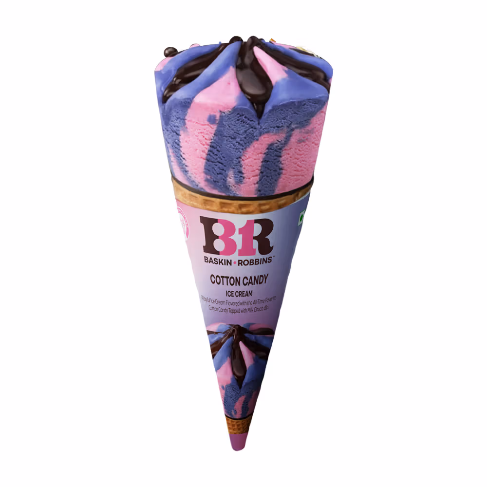 Premium cotton candy flavoured ice cream, topped with rich milk chocolate drizzle, perfect carnival-inspired dessert treat, served in crispy wafer cone