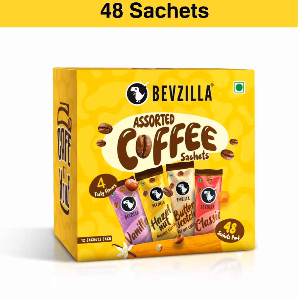 48 sachets (96 g) instant coffee, 4 flavours - Hazelnut, Classic, Vanilla & Butterscotch. Perfect for Espresso, Latte & Cappuccino. Single-serve, easy to use