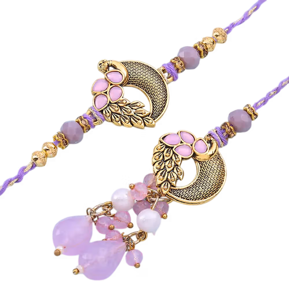 Elegant peacock design with gold accents, handcrafted with purple thread and beads, perfect bhaiya-bhabhi rakhi set, traditional yet contemporary style
