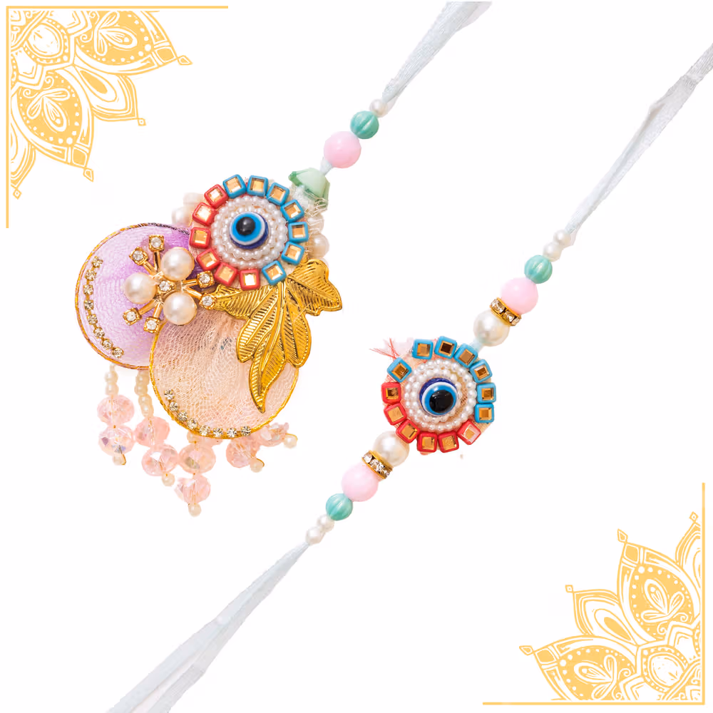 Handcrafted with premium materials, features evil eye protection symbol, adorned with pearls and colorful beads, includes complete rakhi ceremony essentials