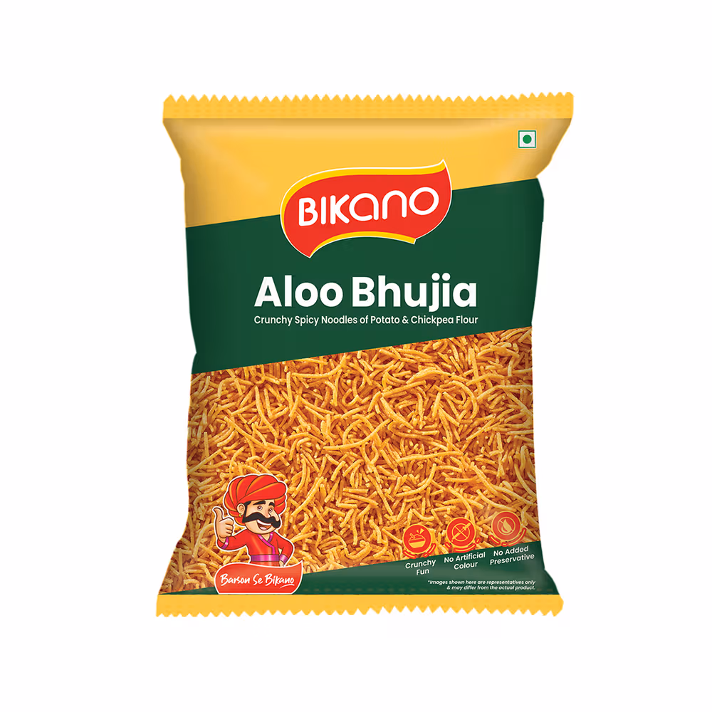 Potato (51.3%), Edible Vegetable Oil (Refined Ricebran Oil, Refined Cottonseed Oil, Refined Palmolein Oil), Rice Flour, Chickpea Flour (5%), Spices and Condiments (Red Chilli Powder, Dried Mint, Dried Mango Powder, Cumin Powder, Gooseberry Powder, Coriander Powder, Cardamom Powder, Green Chilli Powder, Nutmeg Powder, Dried Ginger Powder, Carom Seeds Powder, Black Pepper Powder), Husked Dew Moth Bean Flour, lodized Salt, Sugar (Sucrose), Onion Powder, Garlic Powder, Black Salt, Asafoetida, Acidity regulators (E296 & E330), Contains Added Flavours (Natural and Nature Identical Flavouring Substances)