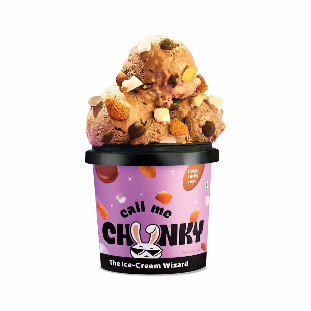 Decadent chocolate ice cream with marshmallows, premium almonds and chocolate chunks, perfect indulgence for dessert lovers, creamy texture with chunky mix-ins