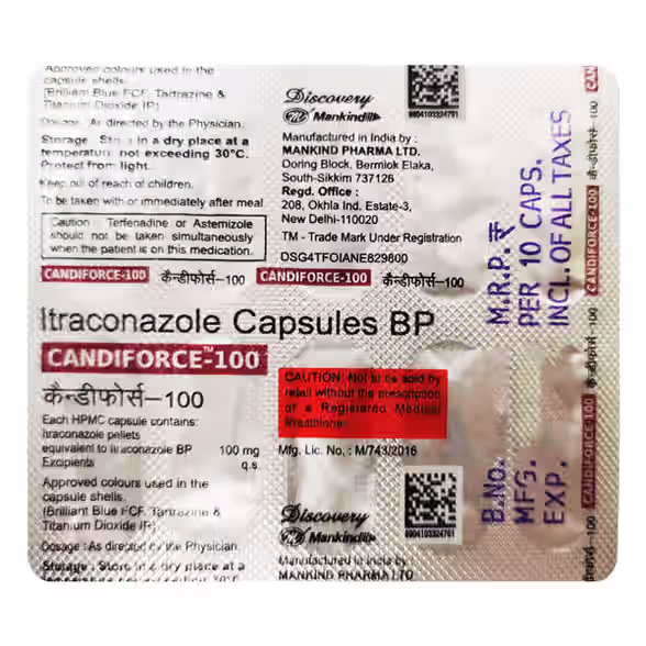 An antifungal medicine used to treat infections of the skin, nails, mouth, and internal organs. It works by stopping the growth of infection-causing fungi and helps clear symptoms like itching, redness, and discomfort. This medicine is to be taken with food. Mild nausea, stomach pain, headache, or dizziness may occasionally occur but settle over time.