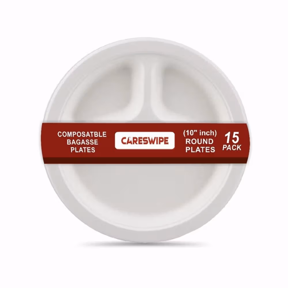 Careswipe disposable plates with three compartments, sturdy construction holds food securely, disposable for quick cleanup after events