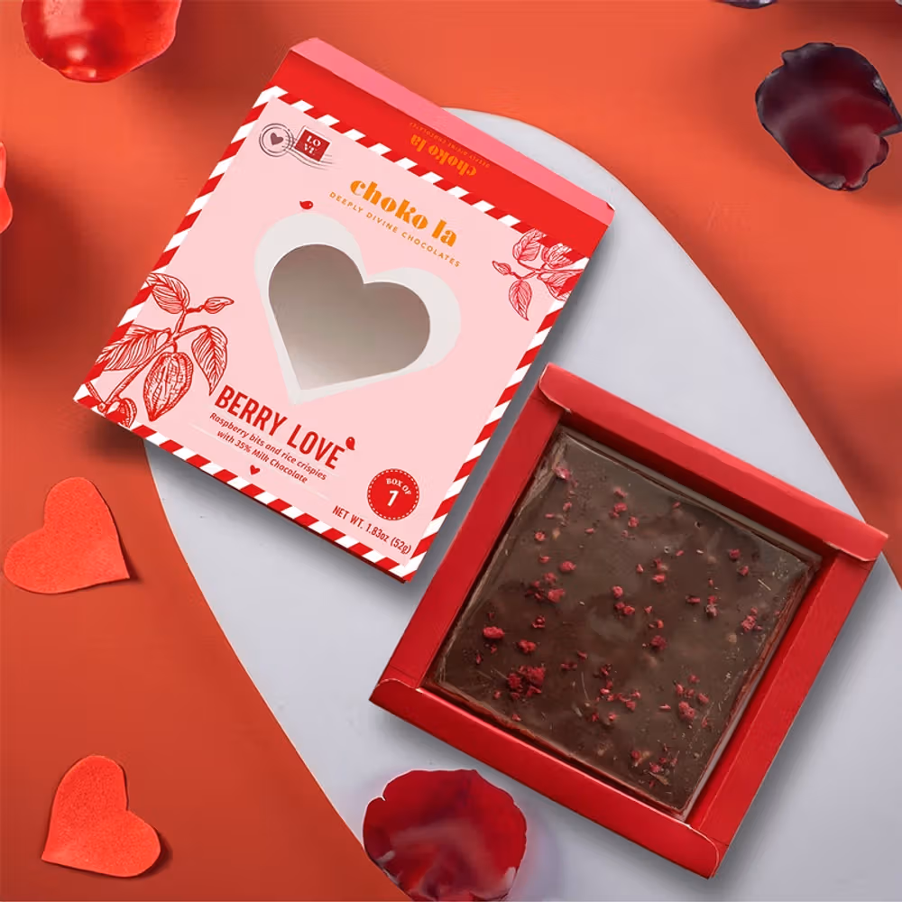 Premium milk chocolate with 35% cocoa, infused with crispy rice for texture, topped with real raspberry crumble