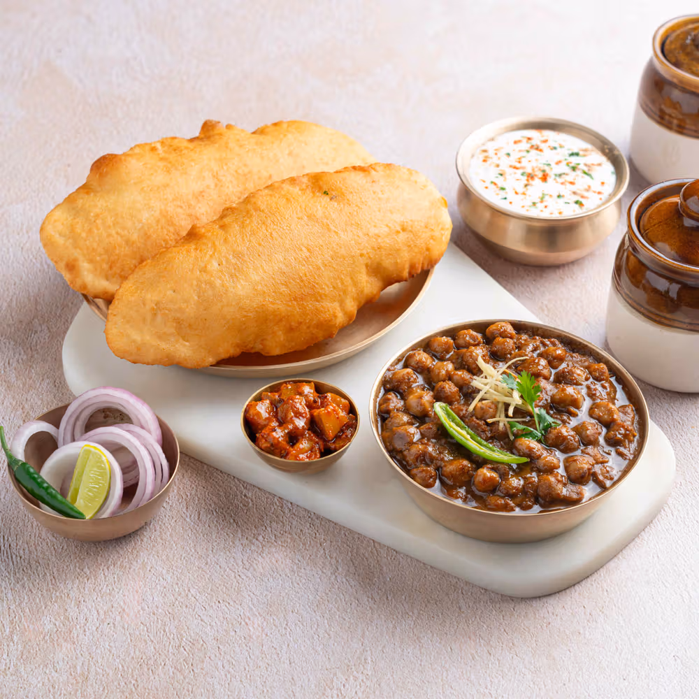 A popular North Indian dish of spicy chickpeas served with deep fried bhature a fluffy bread