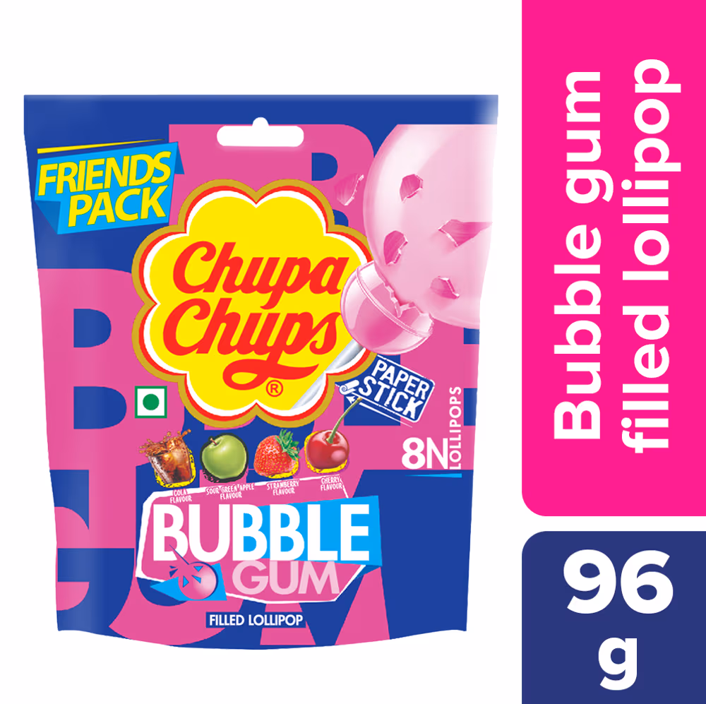 STRAWBERRY & TUTTI FRUTTI FLAVOURS: Sugar Boiled Confectionery (75%): Sugar, Liquid Glucose, Acidity Regulators (INS 330, INS 270, INS 296), Flavour (Nature-Identical), Colour (INS 122) Bubble Gum (25%): Sugar, Gum Base, Liquid Glucose, Humectant (INS 422), Dextrose, Flavour (Artificial (Tutti Frutti)), Dehydrated Fruits Powder [Strawberry (0.14%), Watermelon (0.1%), Cherry (0.1%)), Emulsifier (INS 322), Antioxidant (INS 321), Colour (INS 122). COLA & TUTTI FRUTTI FLAVOURS: Sugar Boiled Confectionery (75%): Sugar, Liquid Glucose, Acidity Regulators (INS 330, INS 270, INS 296), Flavour (Nature-Identical), Colours (INS 102, INS 122, INS 133) Bubble Gum (25%): Sugar, Gum Base, Liquid Glucose, Humectant (INS 422), Dextrose, Flavour (Artificial (Tutti Frutti)), Dehydrated Fruits Powder (Strawberry (0.14%), Watermelon (0.1%), Cherry (0.1%)), Emulsifier (INS 322), Antioxidant (INS 321), Colour (INS 122). SOUR GREEN APPLE AND TUTTI FRUTTI FLAVOURS: Sugar Boiled Confectionery (75%): Sugar, Liquid Glucose, Acidity Regulators (INS 330, INS 270, INS 296), Apple Juice (2.8%), Flavour (Nature-Identical), Colours (INS 102, INS 133) Bubble Gum (25%): Sugar, Gum Base, Liquid Glucose, Humectant (INS 422) Dextrose, Flavour {Artificial (Tutti Frutti)), Dehydrated Fruits Powder {Strawberry (0.14%), Watermelon (0.1%), Cherry (0.1%)), Emulsifier (INS 322), Antioxidant (INS 321), Colour (INS 122). CHERRY & TUTTI FRUTTI FLAVOURS: Sugar Boiled Confectionery (75%): Sugar, Liquid Glucose, Acidity Regulators (INS 330, INS 270, INS 296), Flavour ((Artificial (Cherry)), Colour (INS 122) Bubble Gum (25%): Sugar, Gum Base, Liquid Glucose, Humectant (INS 422), Dextrose, Flavour {Artificial (Tutti Frutti)), Dehydrated Fruits Powder (Strawberry (0.14%), Watermelon (0.1%), Cherry (0.1%)), Emulsifier (INS 322), Antioxidant (INS 321), Colour (INS 122). Equivalent to 2.3% Fruit Juice