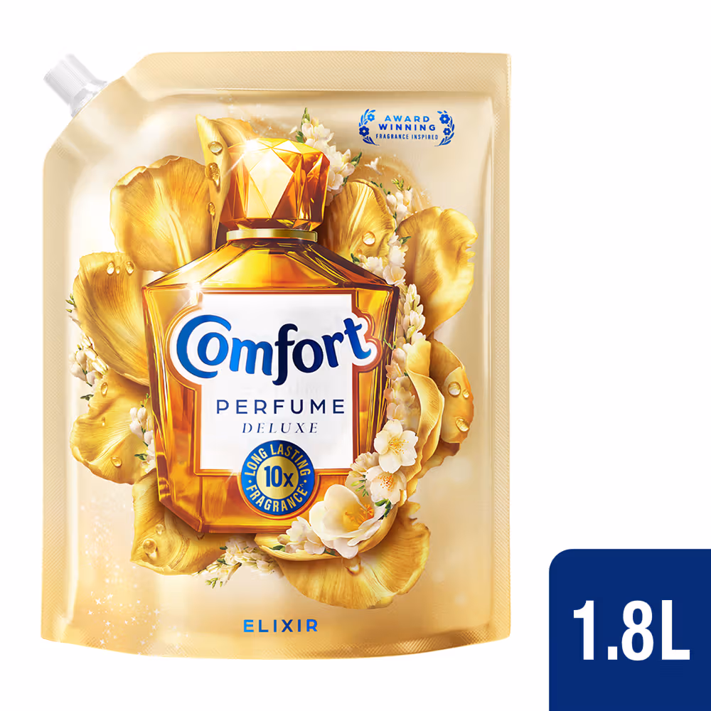 Experience long-lasting freshness and softness with comfort perfume deluxe elixir fabric conditioner, leaving your clothes with a delightful floral fragrance