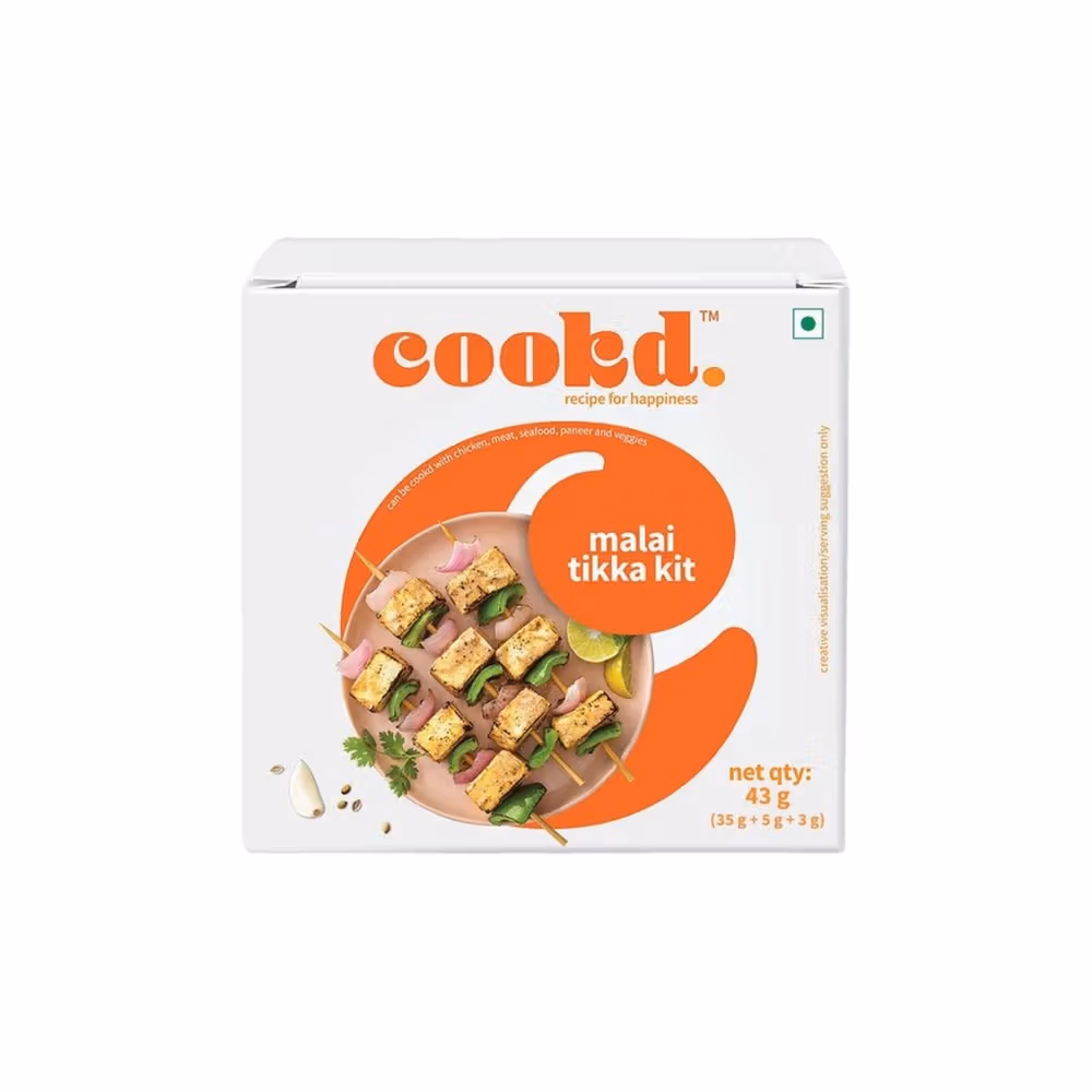 Combine the malai tikka marinade with 1/4 cup (90 g) of curd, marinate the protein (approx. 500 g), refrigerate for 20-30 minutes or up to 4-6 hours, heat a pan/grill pan, add/brush 1 tsp of oil and grill till cooked, add the tikkas in a bowl, add the tangy seasoning and the tandoori oil, mix well to combine and enjoy