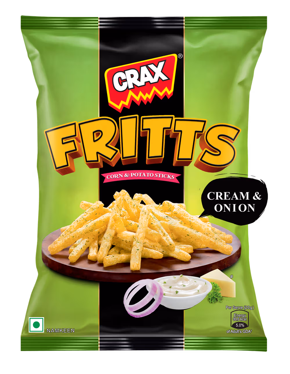 Delicious rich cream & onion flavor, crispy french fries styled corn and potato snack, non fried for guilt free snacking, no transfat