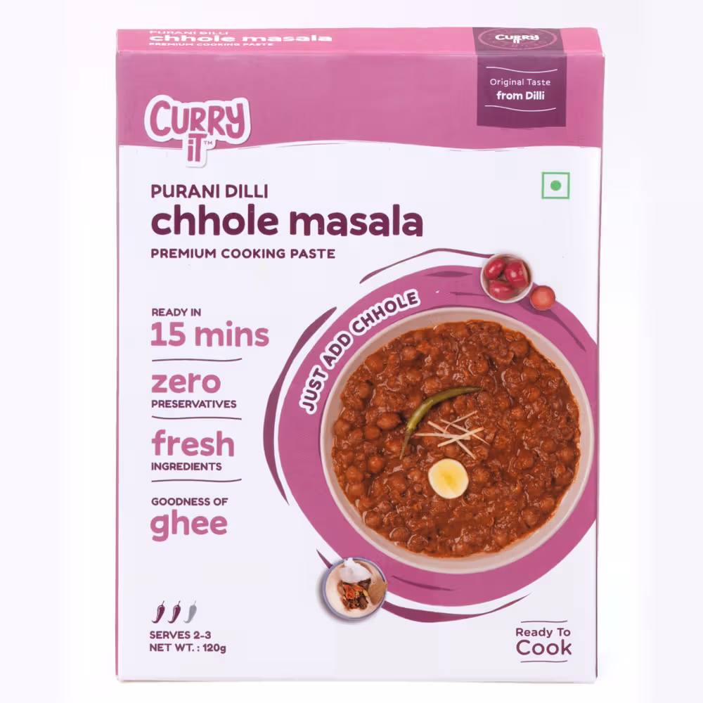 In a pressure cooker, add 120 g chhole/white grams (soaked overnight) and 250ml of water. Add CURRYiT Magic Pouch and pressure cook for 15 - 16 whistles on high flame. Release pressure, add CURRYiT Purani Dilli Chhole Masala paste (1 full pack) and simmer for 5-6 mins