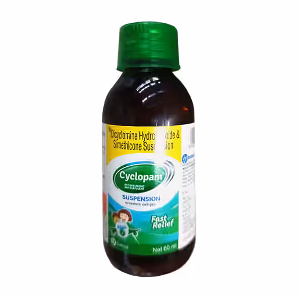 A liquid medicine used for relief from abdominal cramps, bloating, and gas in children. Shake the bottle well before use. Take before meals to help prevent these gastric symptoms that generally occur after consuming food. Common side effects include drowsiness, dry mouth, blurred vision, or constipation.
