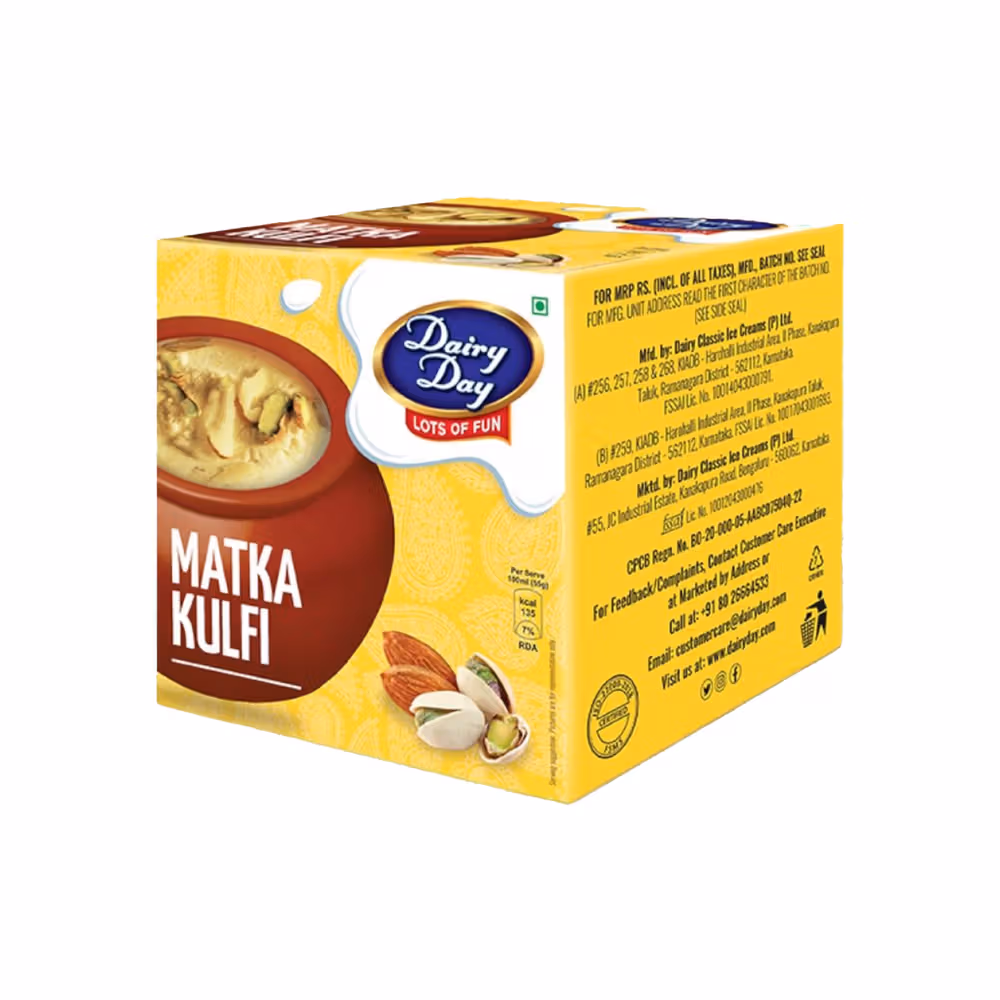 Milk and Milk Solids, Sugar, Almond (3%), Pista (3%), Emulsifiers and Stabilisers (INS 471, 477, 412, 410), and Added Flavour - Nature Identical and Artificial Kulfi Flavouring Substances
