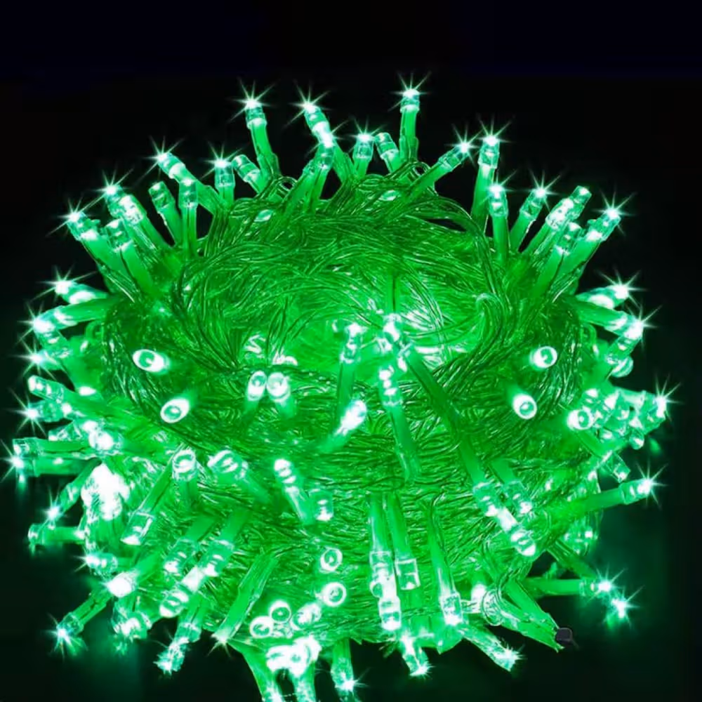 12 meters of vibrant green lights, flexible and durable design, corded electric power, perfect for indoor and outdoor use