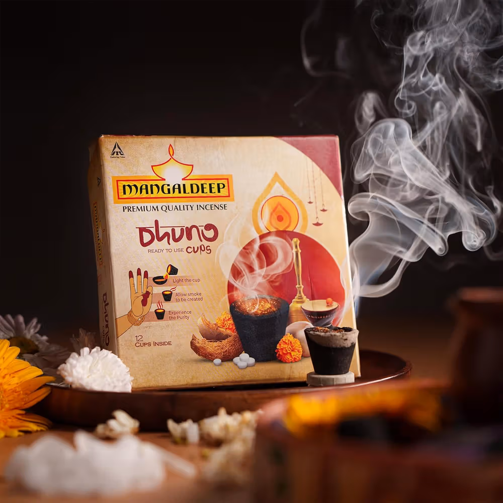 Experience the aromatic essence of Mangaldeep Dhuno Cups, crafted with Chhobra, Camphor, and Dhuno, creating a divine and soothing ambiance for pooja and worship