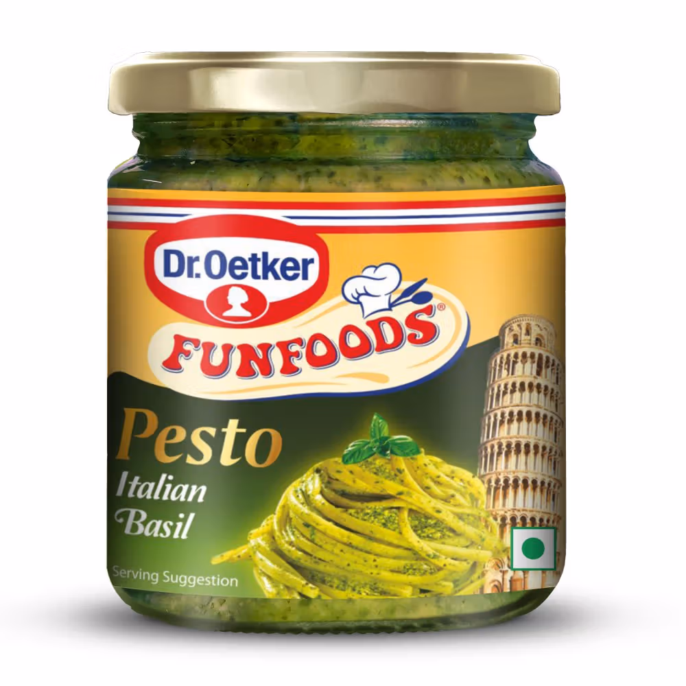 Dr. Oetker FunFoods Pesto Sauce brings authentic Italian flavor with fresh basil, real parmesan, and crunchy cashews. Perfect for pasta, sandwiches, wraps, or as a dip, this ready-to-use sauce delivers creamy, aromatic taste and gourmet-style meals effortlessly