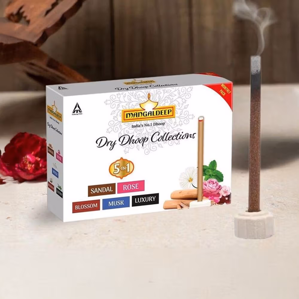 Mangaldeep Dry Dhoop Sticks offer a diverse range of aromas including sandal, rose, musk, and blossom, creating a calming and spiritual atmosphere