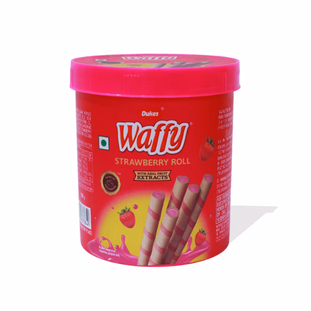 Strawberry-flavored wafer rolls, crunchy and creamy texture, vegetarian-friendly, long shelf life