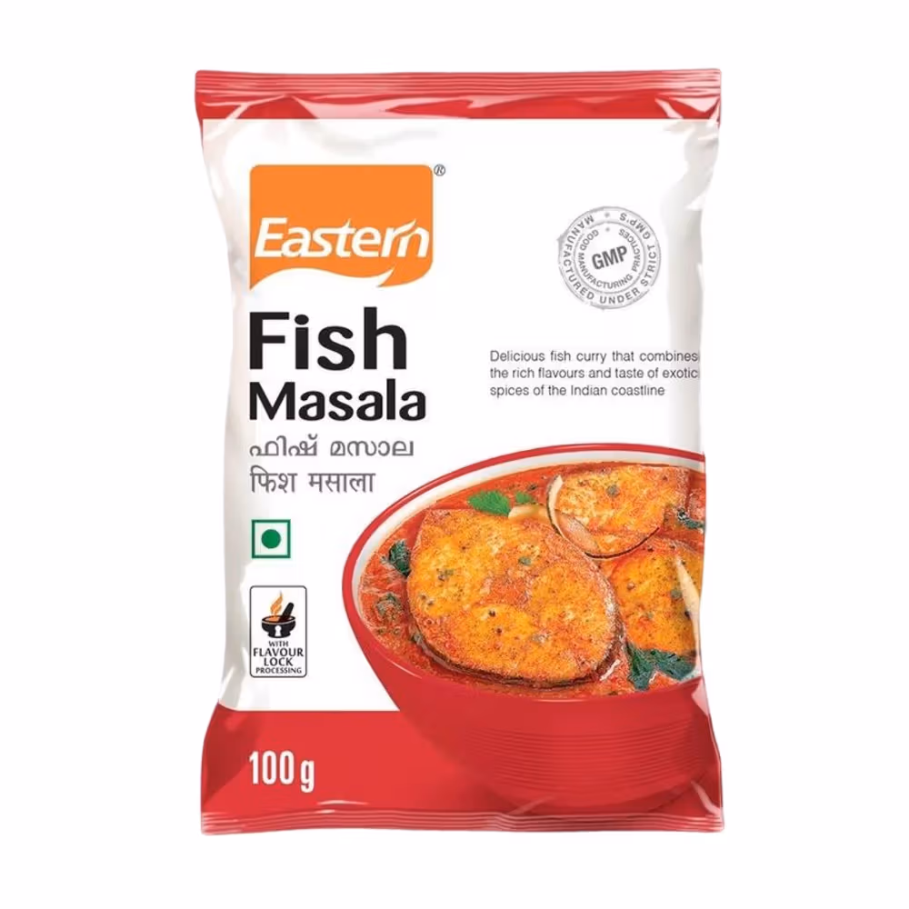 Add eastern fish masala (50 g) and stir well. Put the fish pieces (clean and cut-1 kg) into this, along with cambodge water (4 cups) and salt (to taste). Cook on a low flame till done