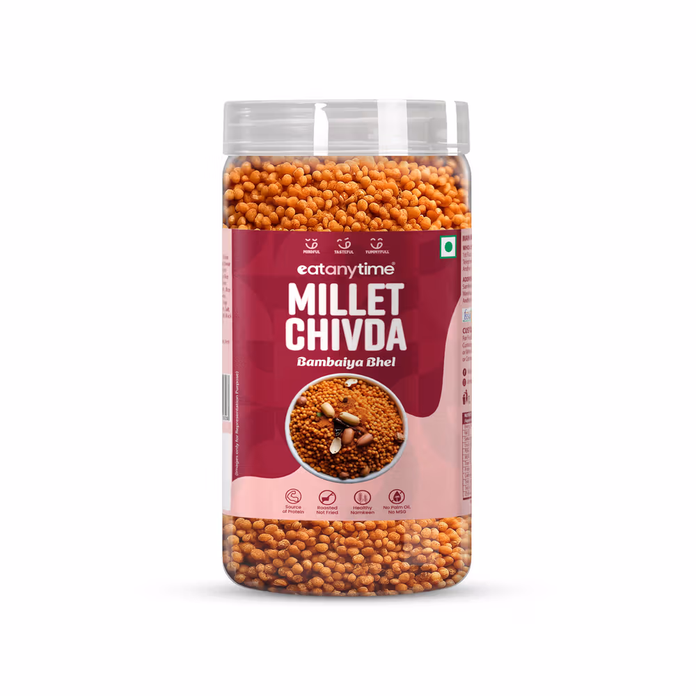 The Bambaiya bhel millet chivda offers a nutritious and delicious snack with authentic Mumbai street food taste. It is high in protein and fiber