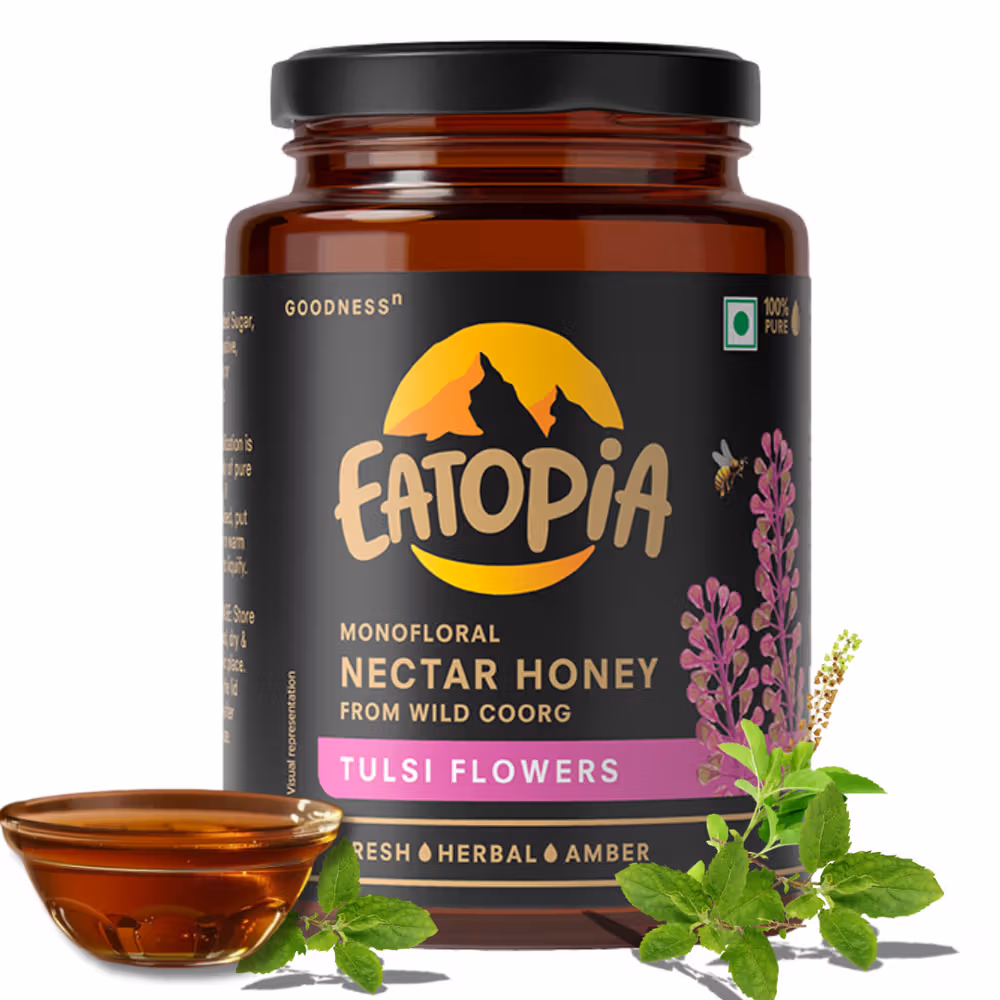 Pure monofloral nectar from tulsi flowers, sourced from pristine valleys of coorg, free from added sugars and chemicals, rich in medicinal properties