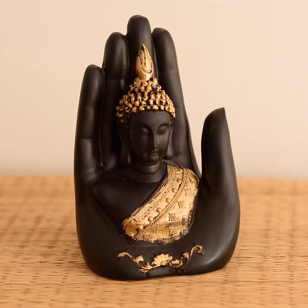 Handcrafted palm Buddha statue, symbolizes peace and tranquility, made from durable polyresin, perfect for home decor
