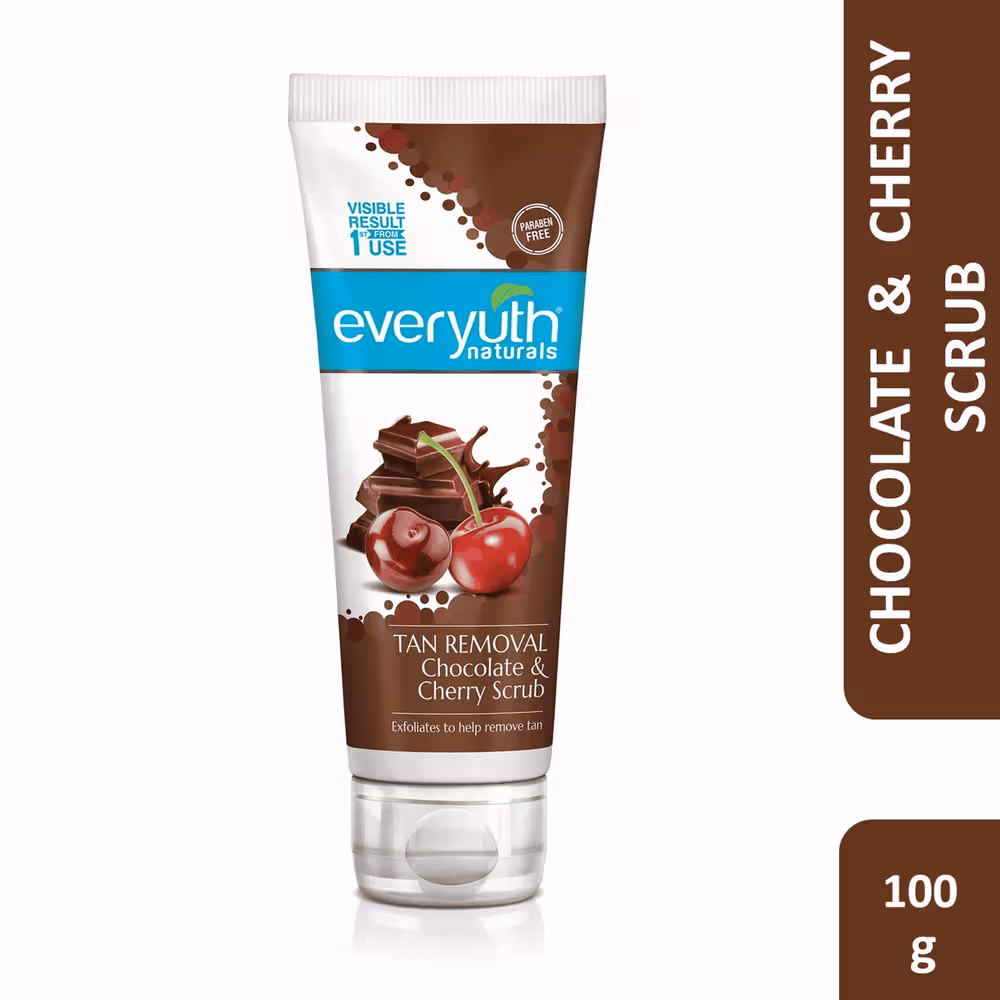 Experience the dual power of detoxification and brightness with Everyuth Naturals Chocolate Cherry Tan Removal Scrub, formulated with luxurious chocolate and vitamin-rich cherries. This scrub works to deeply cleanse and rejuvenate your skin by removing tanned dead cells and enhancing your natural glow. Chocolate, known for its detoxifying properties, works together with nutrient-packed cherries to combat skin dullness and remove tan. This combination not only cleanses the skin but also provides antioxidants that protect and enhance skin texture