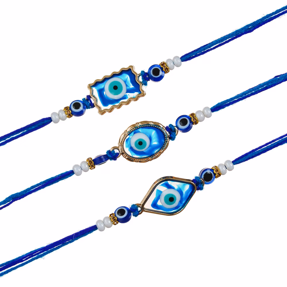 Protective evil eye design, handcrafted with premium materials, includes traditional roli chawal, symbolizes sibling bond
