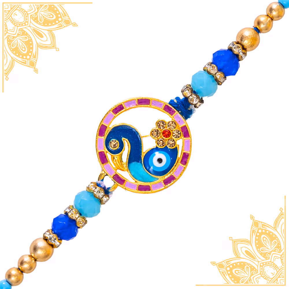 Protective evil eye wards off negativity, crafted with premium multicolored stones, traditional peacock motif for good fortune