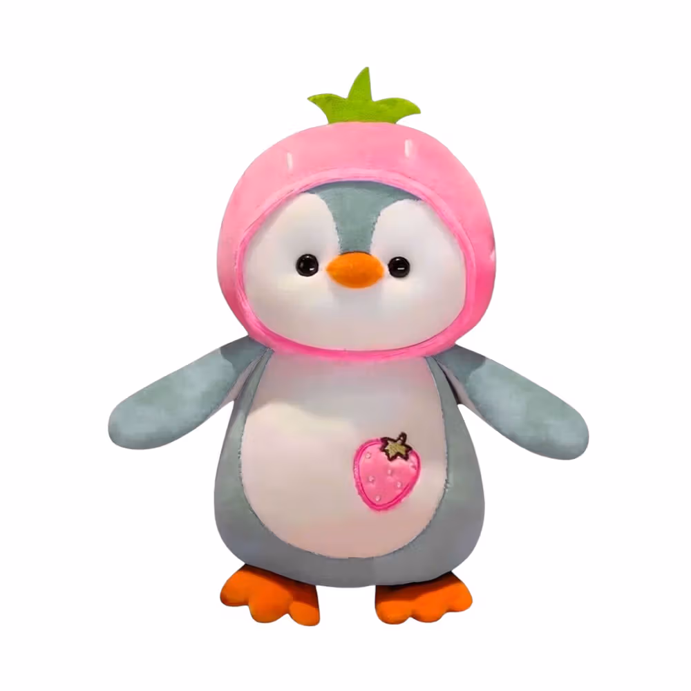 Soft and cozy plush material, dressed in cute strawberry-themed hoodie, perfect cuddly companion for kids, available in assorted designs