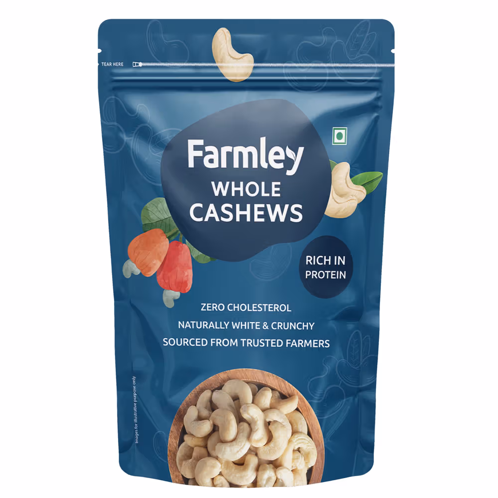 Farmley Whole Cashews are 100% natural, handpicked, and offer a rich source of protein and fiber, making them a healthy and delicious snack for any time