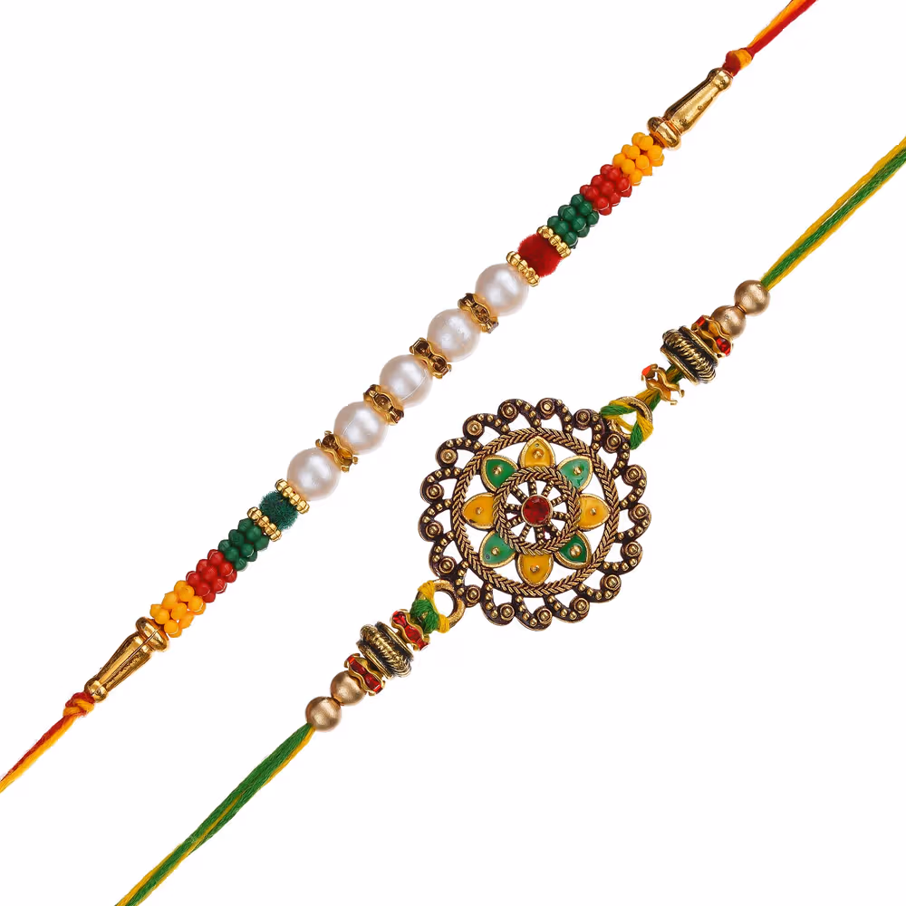 1 pack (2 pcs) Designer Rakhis and 1 pack Roli Chawal
