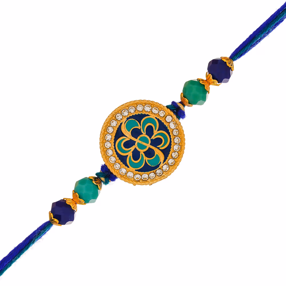 Intricate floral design with crystals, blue and green beads with gold accents, traditional thread bracelet, includes roli chawal for ritual