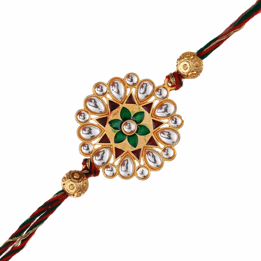 1 x Beautiful Floral Kundan Rakhi and 1 x Roli Chawal Pack