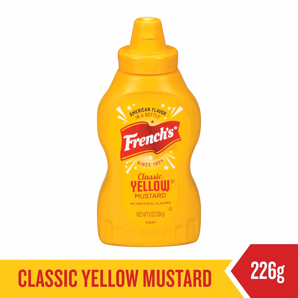French's Classic Yellow Mustard contains 0 calories, 0g total fat, 0g total sugars, and 55mg sodium per serving. It's made with #1 grade mustard seeds and delivers a smooth, tangy mustard flavor . Ingredients include distilled vinegar, water, mustard seed, salt, turmeric, paprika, spice, natural flavor, and garlic powder