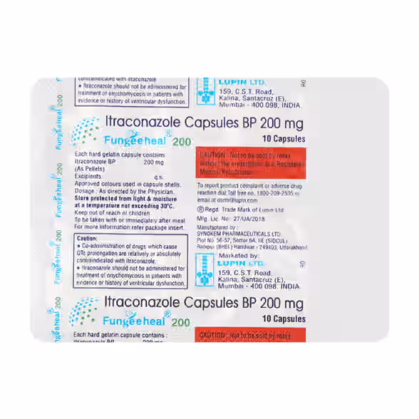 An antifungal medicine used to treat infections of the skin, nails, mouth, and internal organs. It works by stopping the growth of infection-causing fungi and helps clear symptoms like itching, redness, and discomfort. This medicine is to be taken with food. Mild nausea, stomach pain, headache, or dizziness may occasionally occur but settle over time.