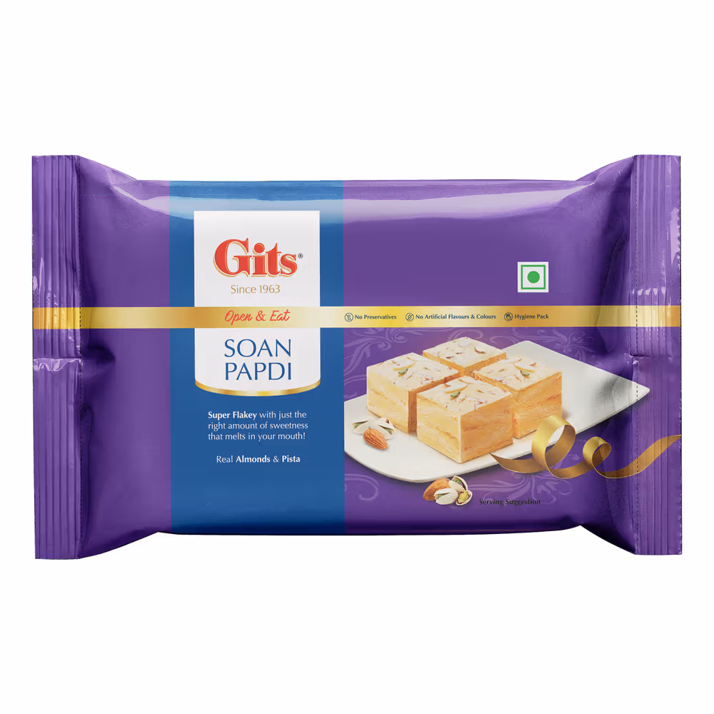Gits Soan Papdi is a delicious Indian sweet made from sugar, gram flour, flour, ghee, and milk. It is a flaky and melt-in-your-mouth sweet