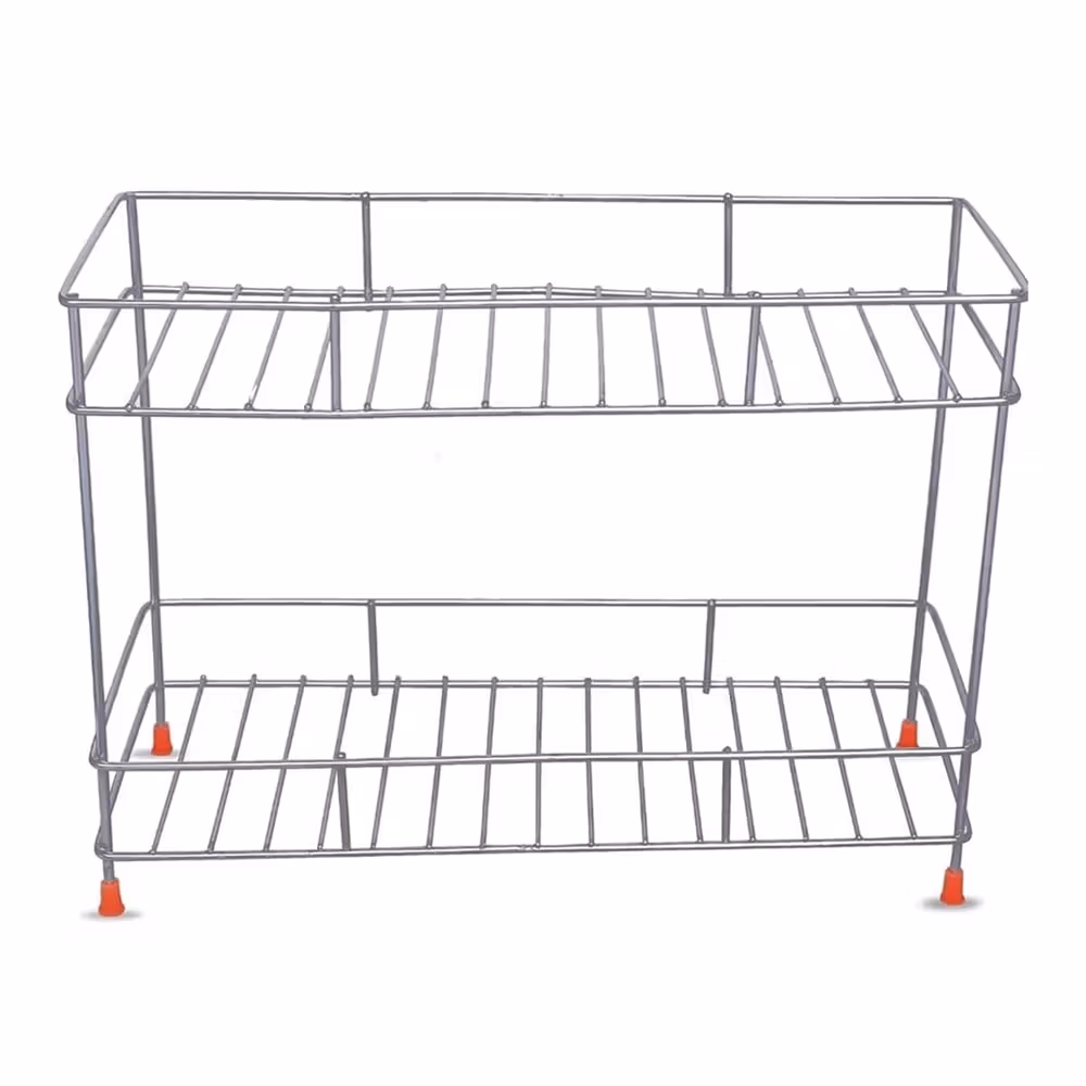 Stainless steel construction, two-tier design for ample storage, modern and sleek appearance, easy to clean and maintain